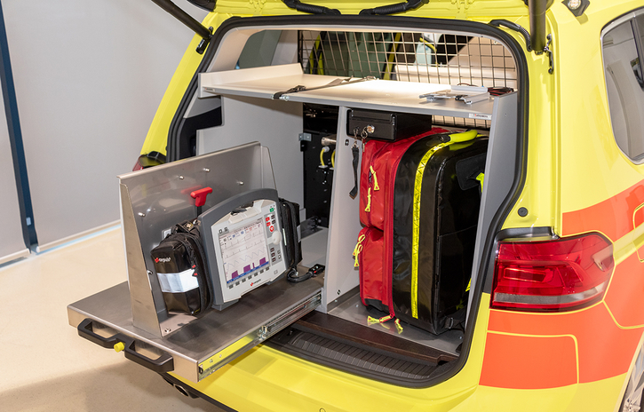 Dieses Notarzt-Einsatzfahrzeug auf Basis eines Volkswagen Touran bietet trotz seines kompakten Ausbaus genug Stauraum für alle wichtigen medizinisch-technischen Geräte, die während eines Einsatzes benötigt werden.